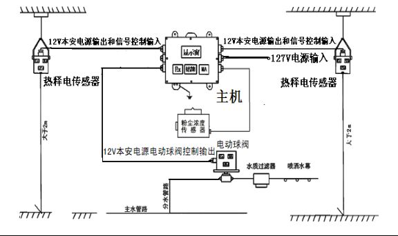 ZP127礦用自動灑水降塵裝置(粉塵超限噴霧)主要由主控箱、電動球閥、熱釋光控傳感器、粉塵濃度傳感器、遙控器、水幕等組成。